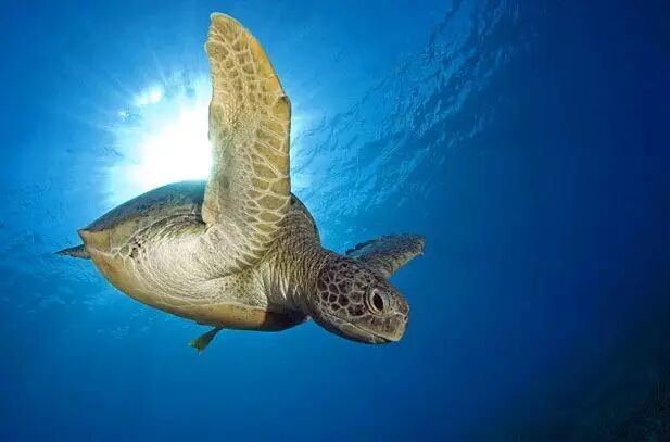 海龟是存在了1亿年的史前爬行动物。海龟有鳞质的外壳,尽管可以在水下待上几个小时,但还是要浮上海面调节体温和呼吸。