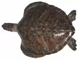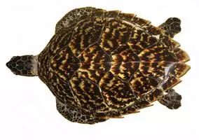 2.海龟鳞(背甲):为类长方形,扇形或不规则四边形的角质薄片。长8~32em,宽9~19cm.厚0.2~0.6ml。表面棕揭色与乳黄色相间斑块状花纹。而具棕褐色或黑色斑点,略旦放射状排列,一般比玳瑁色淡而透明;内面白锴条纹或斑点不明显或无。边缘无斜面。