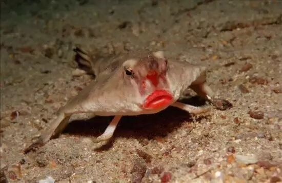 科普一下:生活在拉帕戈斯群岛的红唇蝙蝠鱼(Ogcocephalus darwini),故名思义有着鲜艳的红唇,更特殊的是它有四条「腿」,被视为是世上最丑的鱼种之一。有着一个大头,用胸鳍在海底「行走」。主食是虾、软体动物、小鱼、螃蟹和蠕虫。成年时,其背鳍会长成类似头角的刺状,投影来引诱猎物。长相真的很特别。