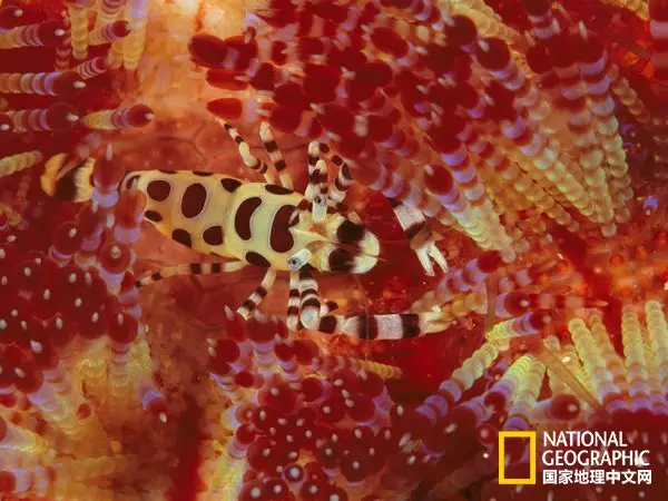 在印度尼西亚科莫多国家公园中,活跃的科尔曼虾已经进化出完美的伪装,能够逃避周围火海胆毒刺的攻击。海胆毒刺的蓝色尖端充满了毒液,但科尔曼虾能够舒适地生活其中,而不受损伤。