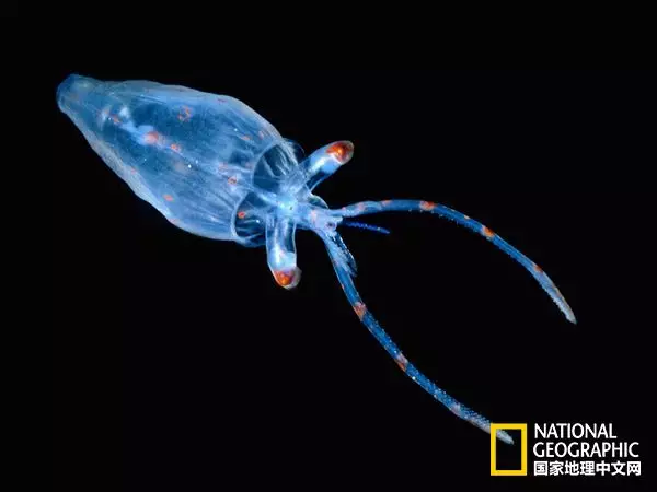 玻璃乌贼得名于其近乎透明的身体,生活在东太平洋的深海。乌贼眼睛和触角中发光的器官被称为发光器,可作为诱饵,帮助乌贼在漆黑的深海找到伴侣。