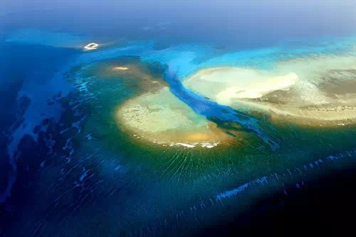 最让人感到神奇的是环礁。想想看,茫茫的大海上突然出现一个由礁石围起的环状区域。在环礁外围,因为海浪不断撞击到环状的礁石上,翻卷起层层浪花,形成了一条浪花带;在环礁内部,是一个湖,有着令人心醉的碧绿色,好像一块通透的翡翠,洁白、湿润的絮状浮云缭绕其上,呈现出深远的宁静。几乎每一个环礁的湖都呈翡翠般的颜色,与浪花带外的深蓝色大海构成强烈对比。