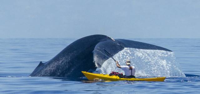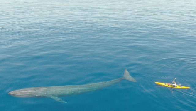 男子乘皮划艇与蓝鲸共游,场面惊险~